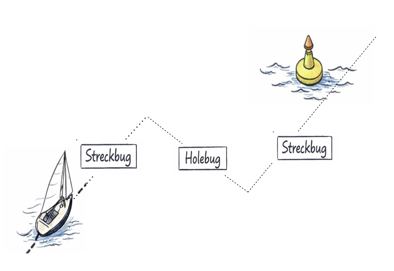 Der Streckbug ist der Schlag, der näher an der direkten Verbindungslinie zum Ziel liegt. Er bringt das Boot optisch und geometrisch näher an den Bestimmungspunkt heran. Der Holebug hingegen führt zunächst weiter in Luv, also scheinbar vom Ziel weg. Das wirkt kontraintuitiv, ist aber aus navigatorischer und segeltechnischer Sicht häufig notwendig.